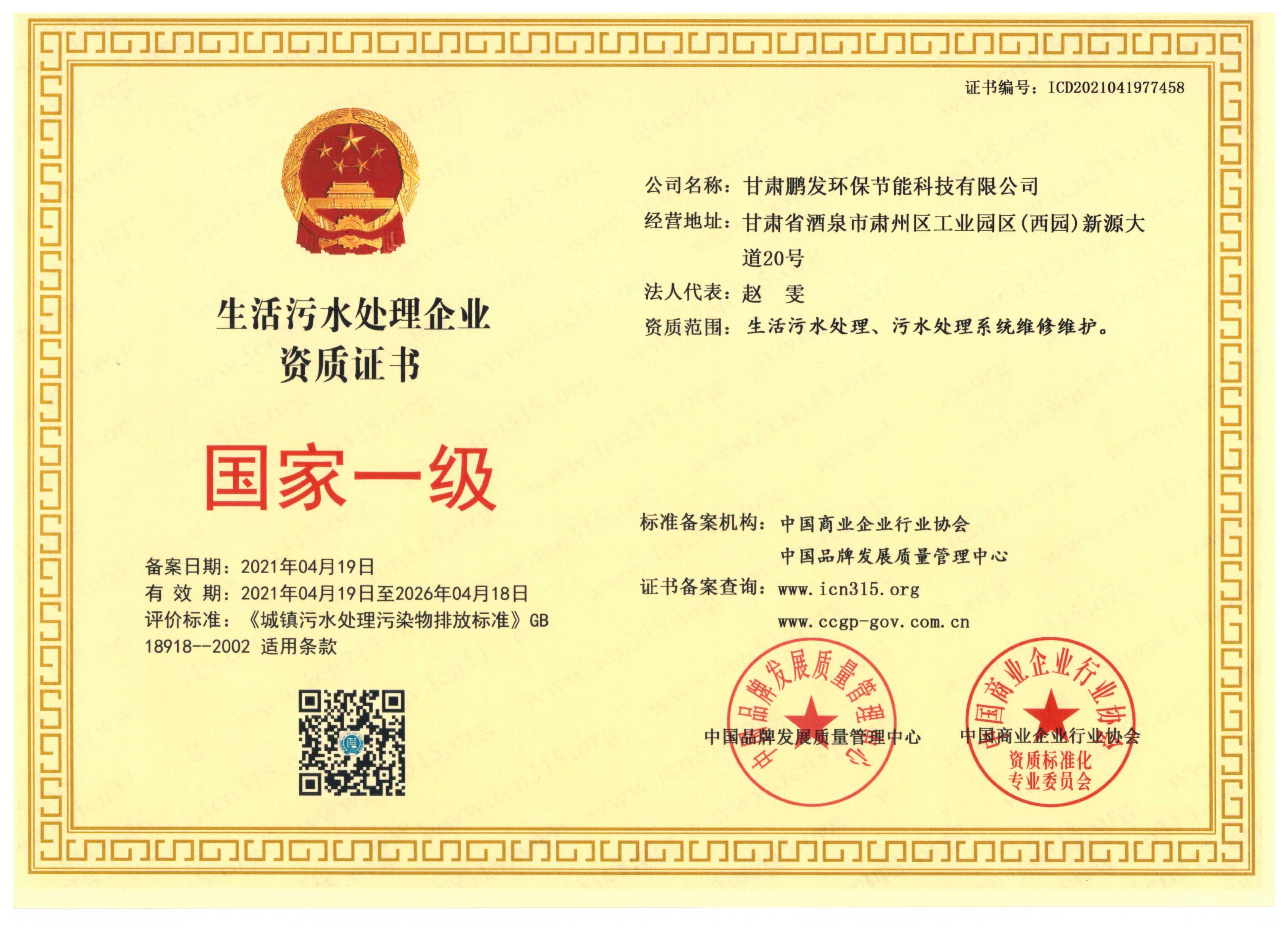 生活污水处理资质证书