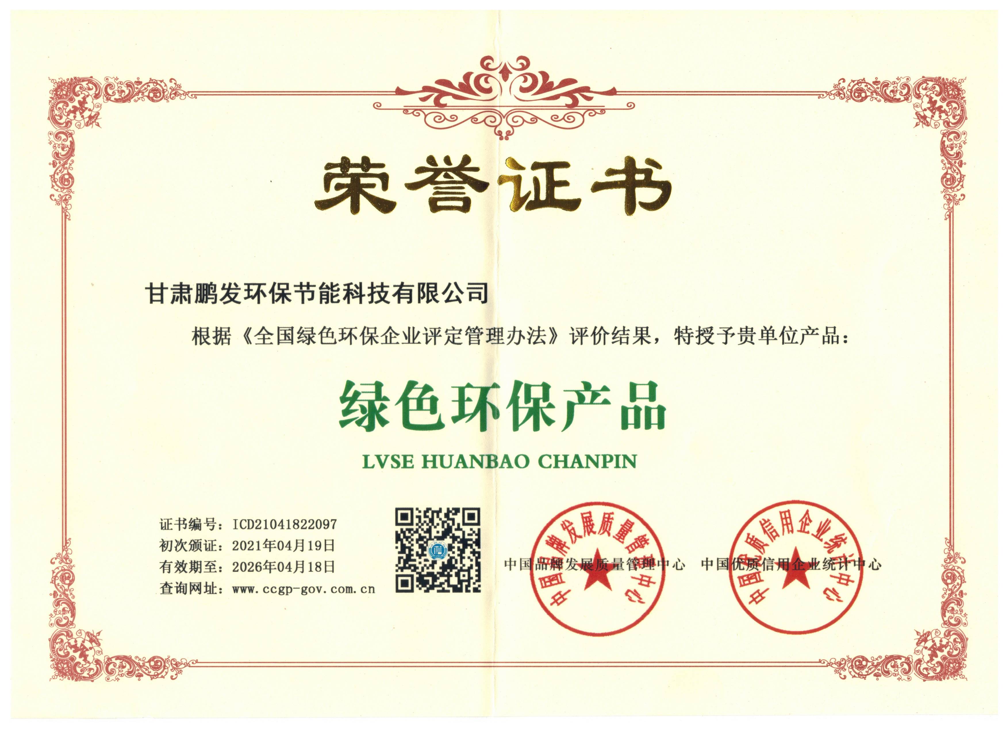 绿色环保产品荣誉证书